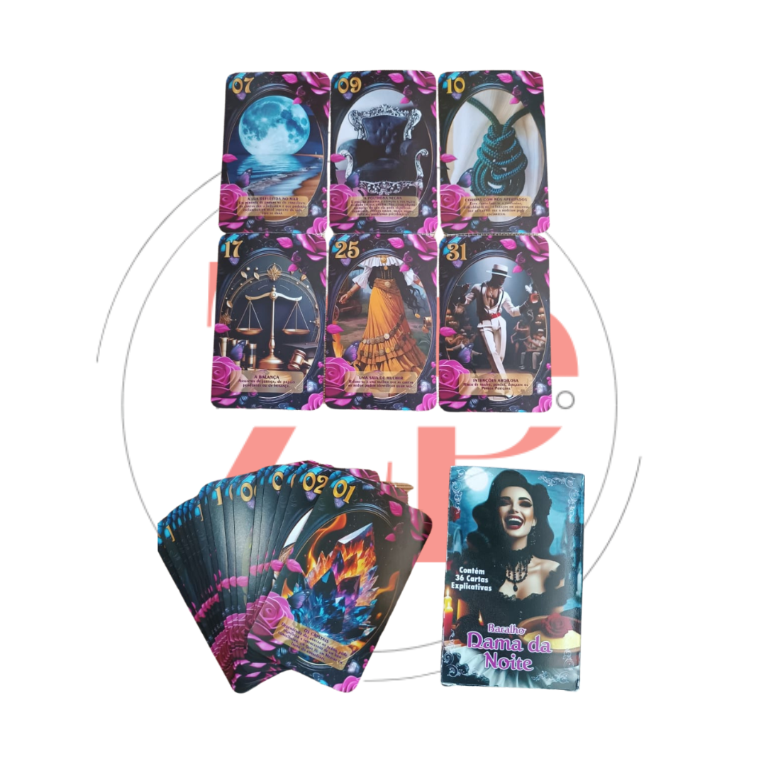 Explore o místico e conecte-se com o universo da espiritualidade com o Baralho Dama da Noite. Composto por 36 cartas belamente ilustradas, este baralho foi criado para trazer clareza, intuição e orientação em suas leituras e reflexões.