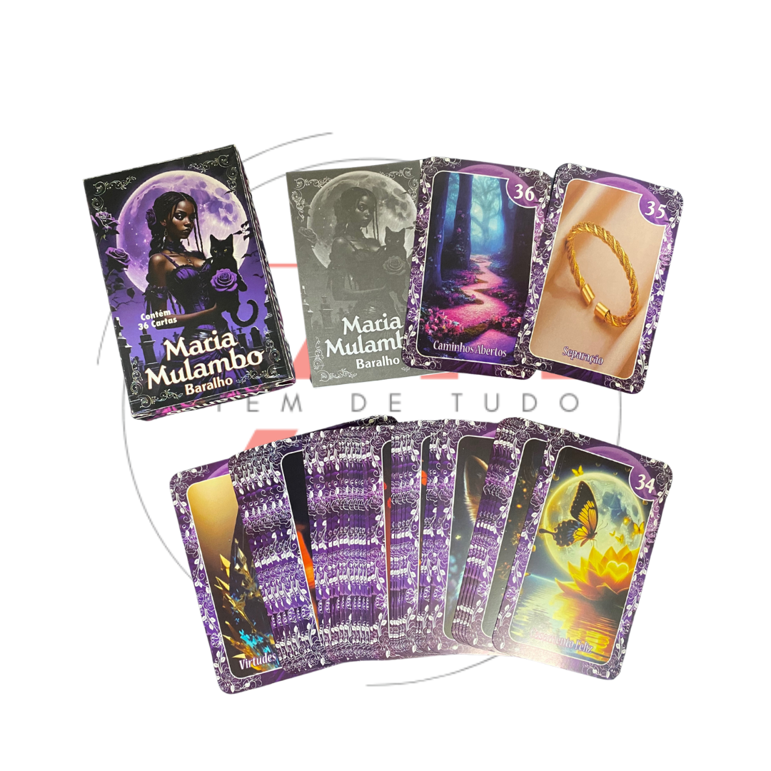 Descubra os mistérios e sabedoria de Maria Mulambo com este exclusivo baralho divinatório, ideal para quem deseja se conectar com a espiritualidade e obter conselhos sobre amor, prosperidade, proteção e superação de desafios.