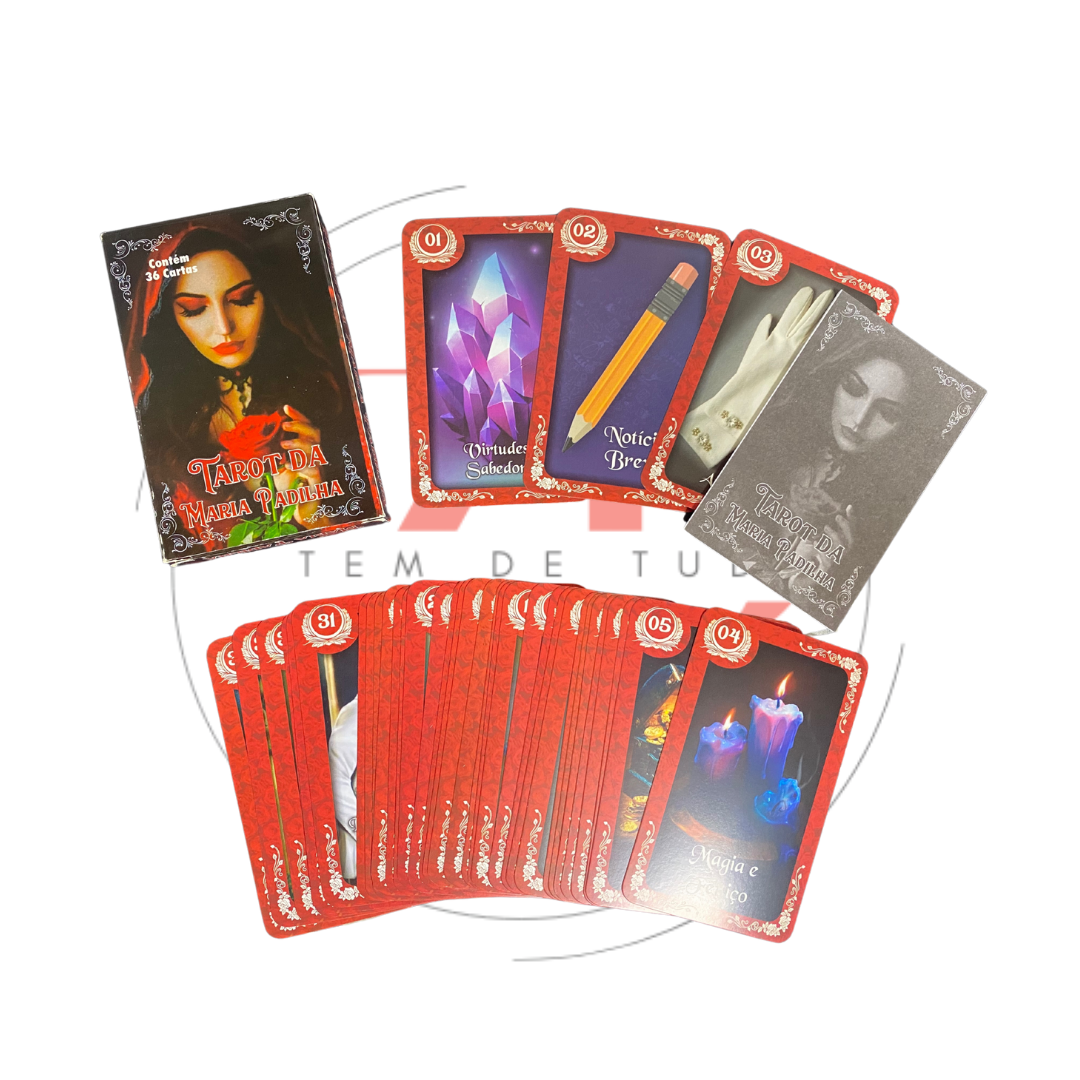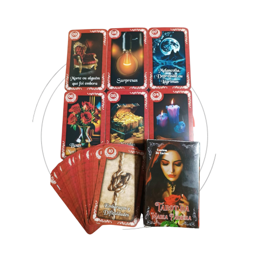 Por que escolher o Baralho Tarot da Maria Padilha? Ao utilizar este baralho, você se conecta com a proteção, sabedoria e intuição de Maria Padilha, guiando suas decisões e ajudando a iluminar seu caminho. As cartas são uma ferramenta poderosa para quem busca respostas claras e orientações espirituais. Adquira já o seu Baralho Tarot de Maria Padilha – 36 Cartas com Manual e deixe que a sabedoria de Maria Padilha ilumine sua vida!